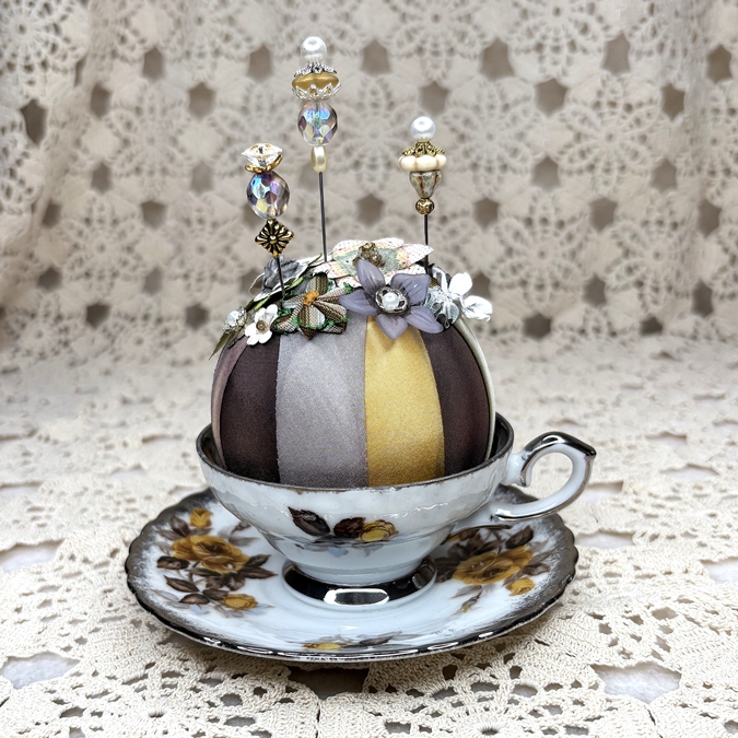 Vintage Cup and Saucer Pincushion Display. Silk ribbon pincushion for pins, and our Pin-Its. These are one of a kind pincushions made with hand dyed silk ribbon, hand dyed flowers, and other embellishments. Comes with the Pin-Its shown. Overall size 4+3/4"x 4+1/2" tall. Pincushion is Styrofoam, and mounted in the cup. Click image for larger images.
